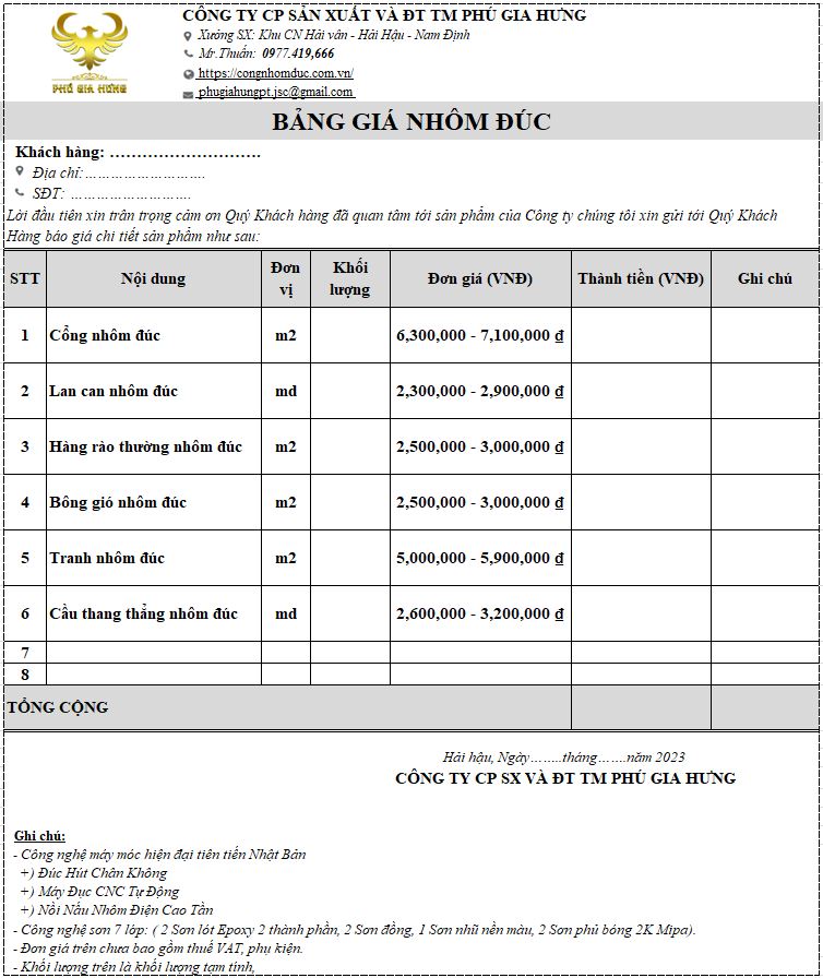 BẢNG BÁO GIÁ SẢN PHẨM NHÔM ĐÚC TẠI CÔNG TY CP SẢN XUẤT VÀ ĐẦU TƯ TM PHÚ GIA HƯNG