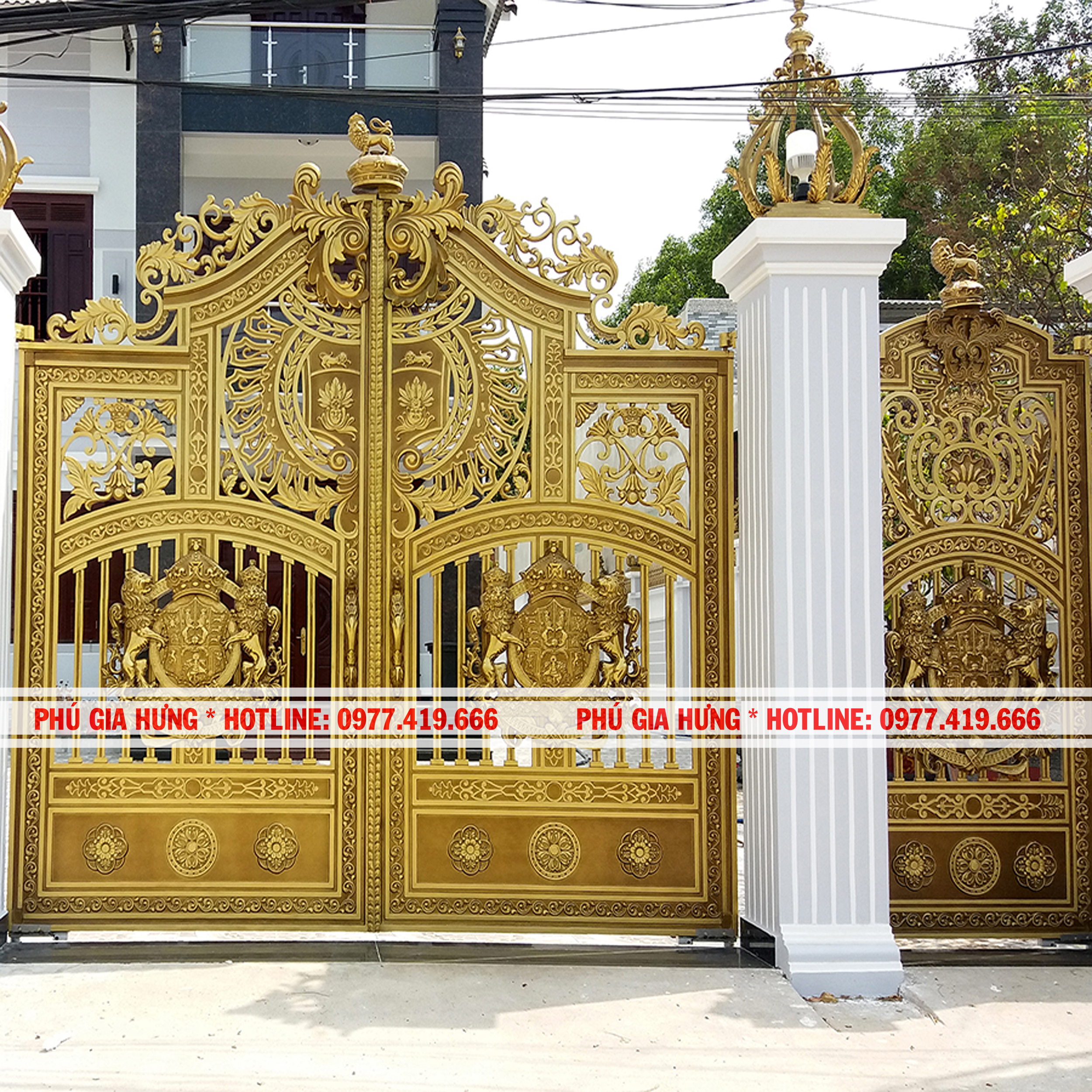 – Bộ cổng với hình ảnh trống đồng ở trung tâm giúp tạo nên sự độc đáo cho mặt tiền của ngôi nhà. Bên cạnh đó là những họa tiết đẹp, chúng có sự kết hợp hoàn hảo đem lại 1 tổng thể cuốn hút. Cổng được sơn màu vàng đồng càng tôn lên nét đẹp sang trọng và đẳng cấp. Phú Gia Hưng sử dụng công nghệ sơn hiện đại với 7 lớp giúp bảo vệ cổng, không xảy ra hiện tượng bong tróc với độ bền màu cao.